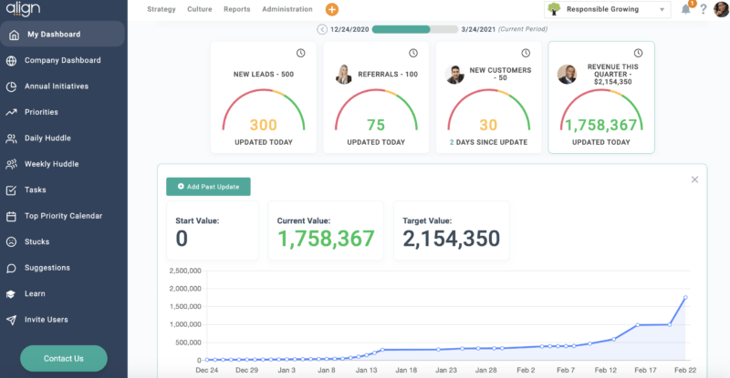 Align’s Weekly Huddle Tool automatically populates progress on individual goal performance as well as other important metrics you establish for each employee.