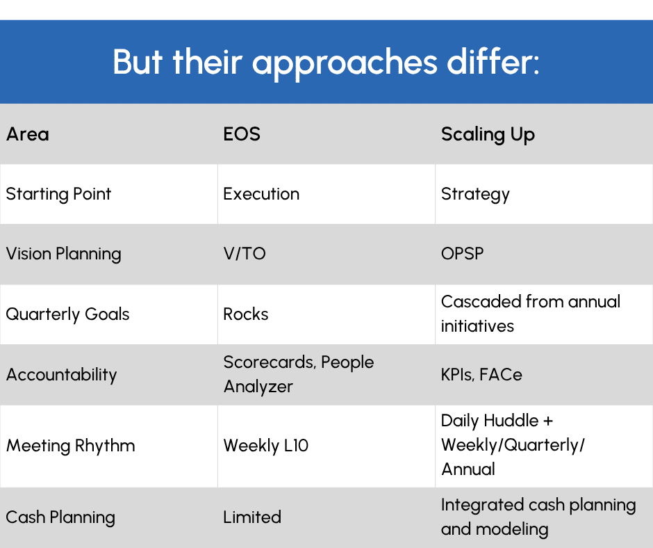 EOS keeps teams on track week to week. Scaling Up aligns long-term goals, market differentiation, and cash needs. Together, they give your organization both discipline and direction.