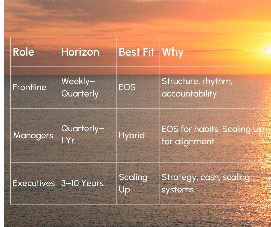 C‑Suite (3–10 Years): Need strategic clarity, cash discipline, and long-term planning. Scaling Up leads here.