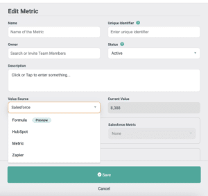 1. Go to the Metrics tab on the lefthand navigation menu in Align. Select the metric (or add a new one) you want to automate through Zapier. Set the “Integration” dropdown to “Zapier”.