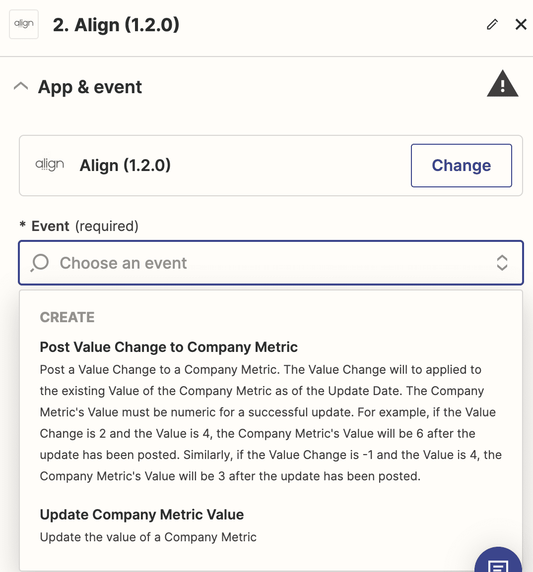 Now that you’ve added the Align app to your Zapier account, create Zaps to update your Metric values in Align based on triggers in Zapier-integrated apps. Follow these these steps: