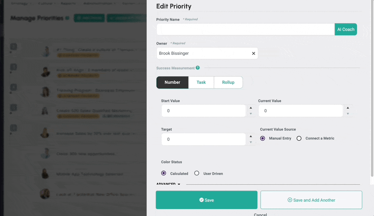 *Note: tasks can be attached to Number and Roll Up Priorities, but they only count towards the progress of Task Driven Priorities.