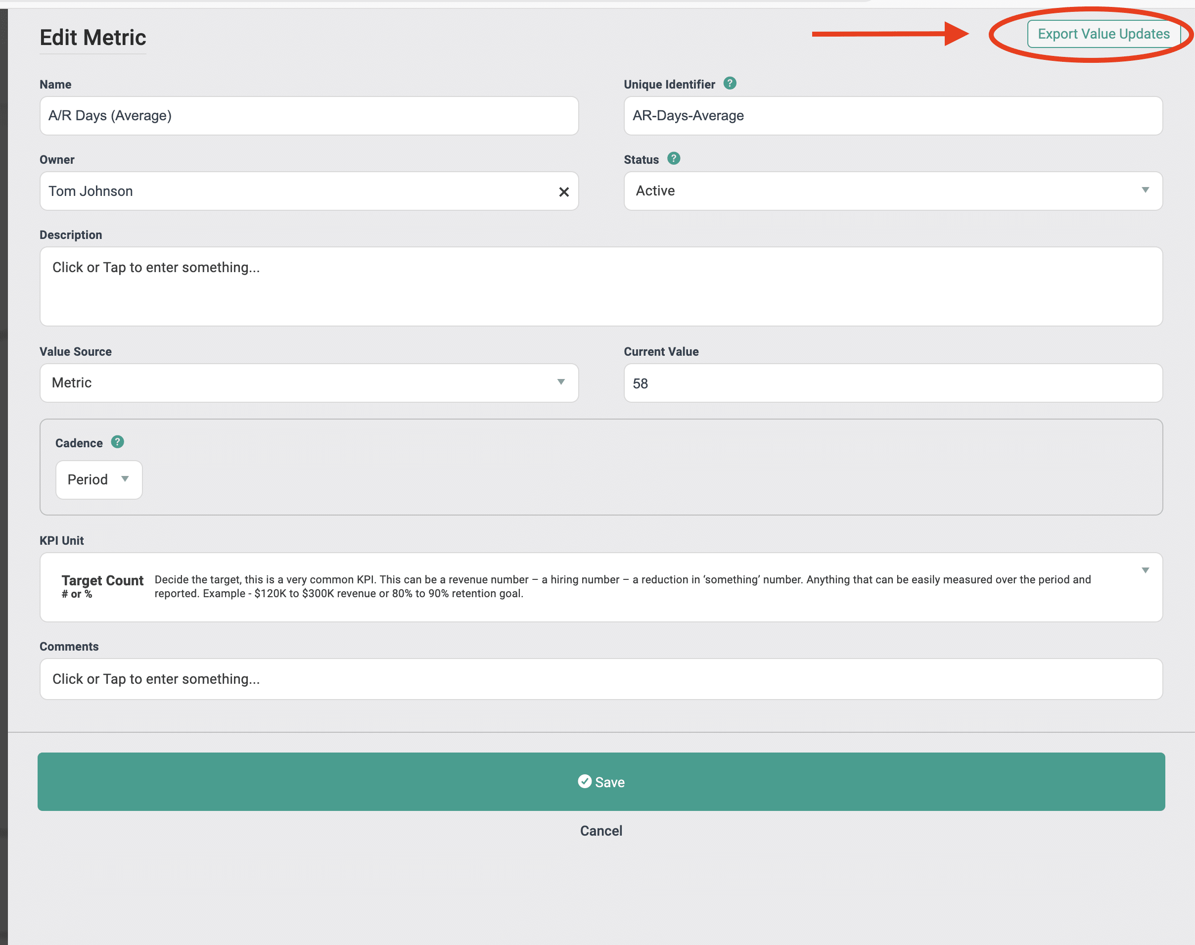 The Metric Owner is the person responsible for the status of the Metric and oftentimes is the one updating the Current Value of the Metric.