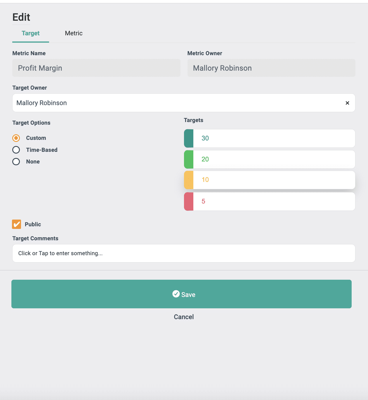 Each Metric with a Target has a unique Target owner. You can: