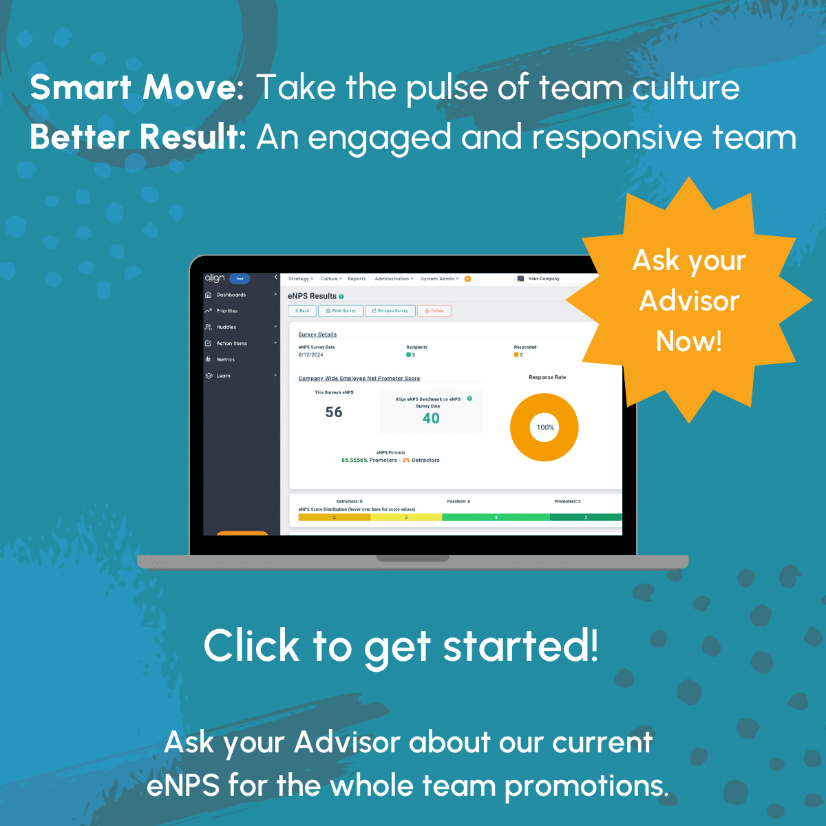 The basic eNPS survey is included in all levels of Align subscriptions. After activating your Align account, eNPS is automatically sent to all users in the account on the 1st of the next month. Here is our FAQ to learn more. Finally, If you don’t yet have the entire team on, you can always check out eNPS for the whole team add-on.