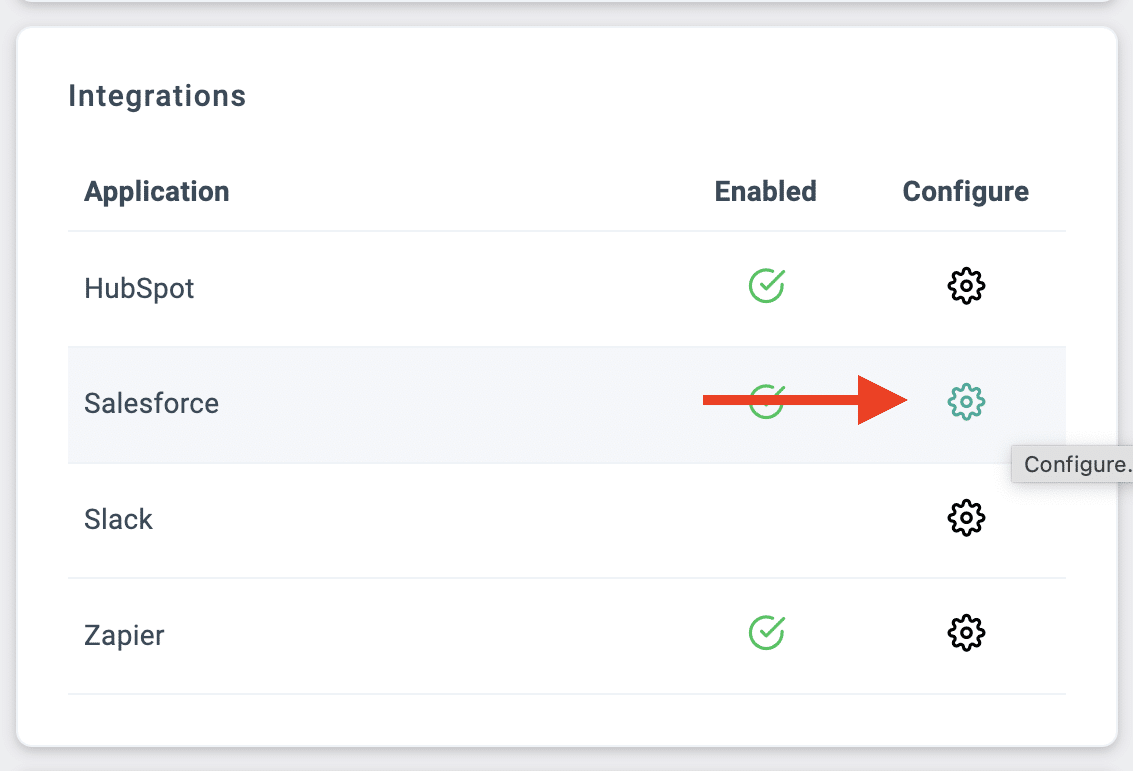 2. In the Integrations sections, click the Configure icon for Salesforce.
