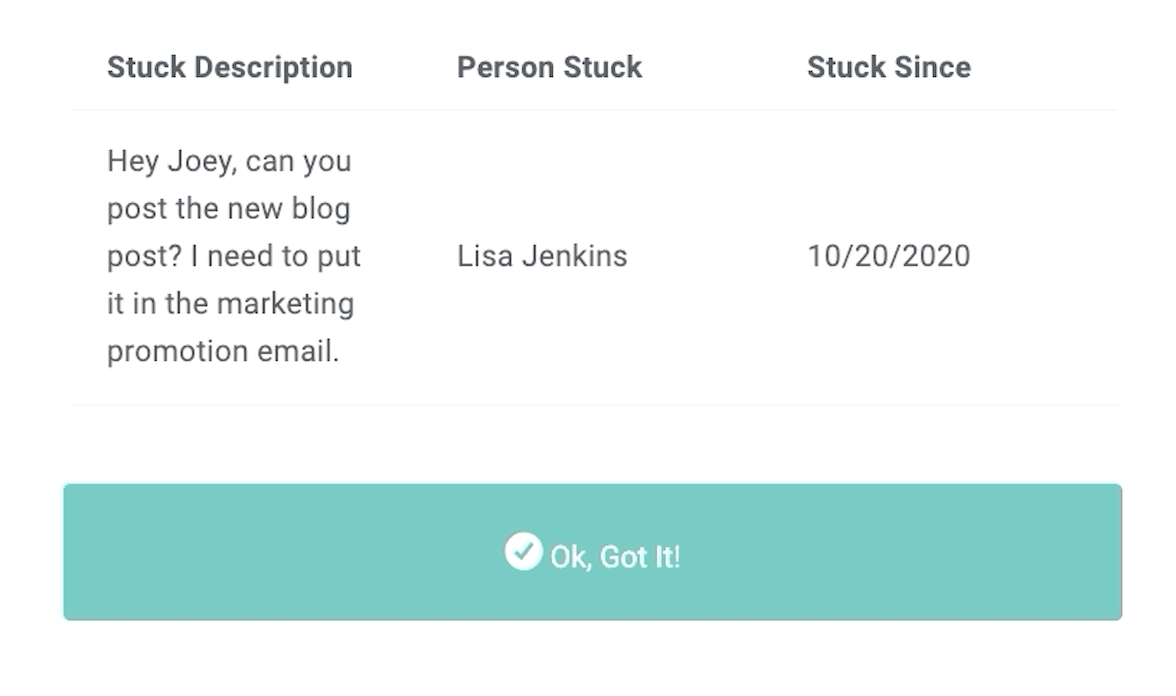 Often goals are not achieved because of cross-ownership work that needs to be done in order to achieve the outcome needed. Align offers users the ability to issue a “stuck” to alert a team member when their help is needed to keep a goal on track. Those who are issued a stuck get alerts when they are issued and reminders until they are cleared.