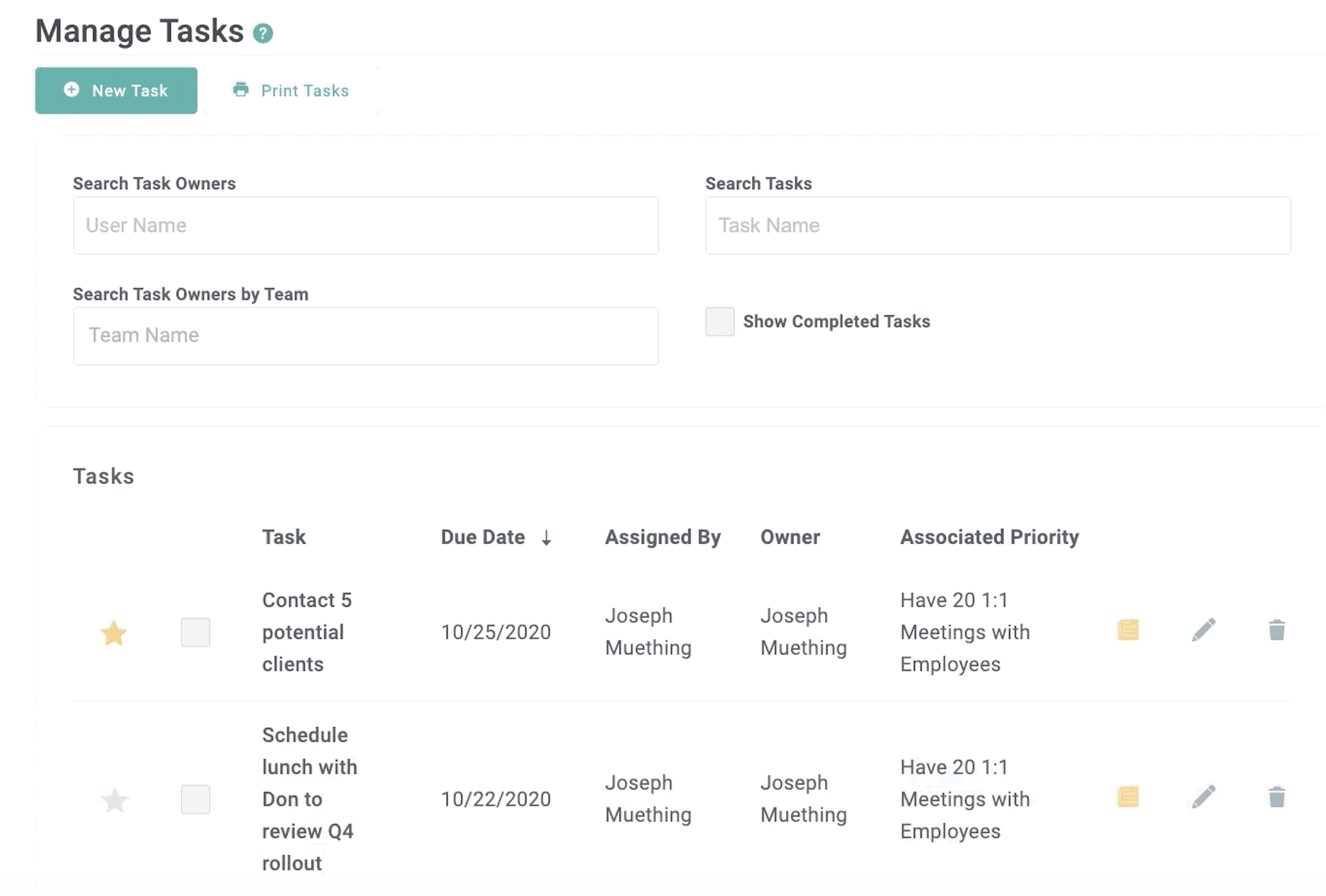 Many goals are not strictly metric measurements and instead require a series of tasks to be completed in order to achieve the outcomes desired. For those goals, tasks can be assigned and tracked by due dates to ensure the goal is achieved on time.