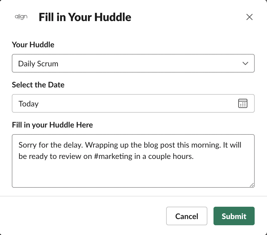 Clicking on the “Update” button on your Daily and Weekly Huddle Personal Alerts or Huddle Slash Commands will allow you to update the “What’s Up” section of your Huddles directly in Slack.