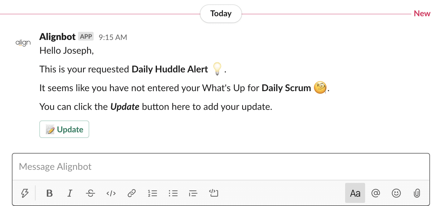 The Align-Slack integration also allows individual team members to receive private alerts to update Align Huddle information, and to update their Huddle information directly in Slack. Users can turn on Slack alerts on the personal integrations page or in the Alerts section of their user profile.
