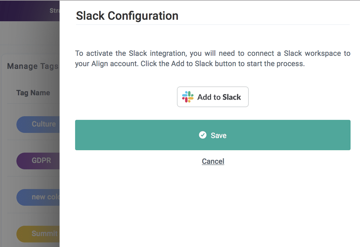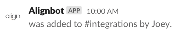 - Receive personal alerts about your Align work in Slack, excluding Tasks.