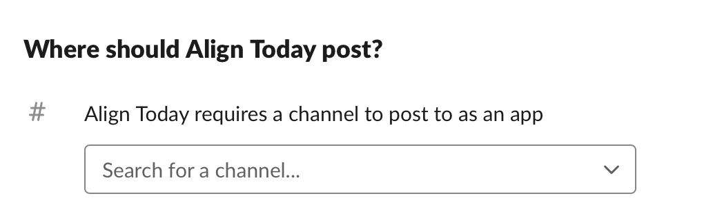 - Once you’ve selected the desired workspace, select your default channel at the bottom of the page. Company-wide progress announcements will be sent from Align to this channel.