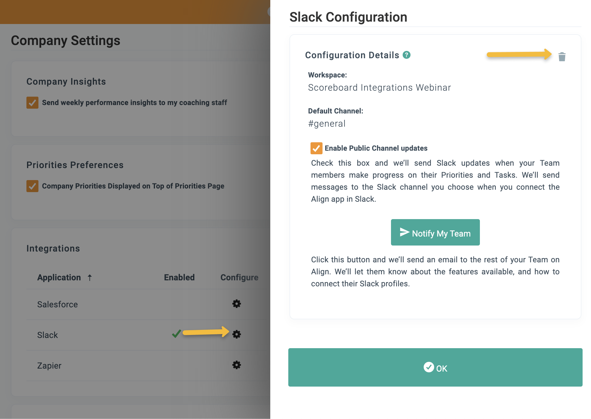 If the Slack toggle is disabled, ask an Align admin in your company to connect your Align account to Slack (see the “Connect Your Company to Slack” section above).