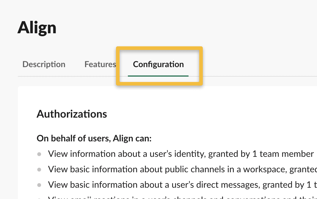 You’ll be redirected to the App settings page in Slack. Click the “Configuration” tab.