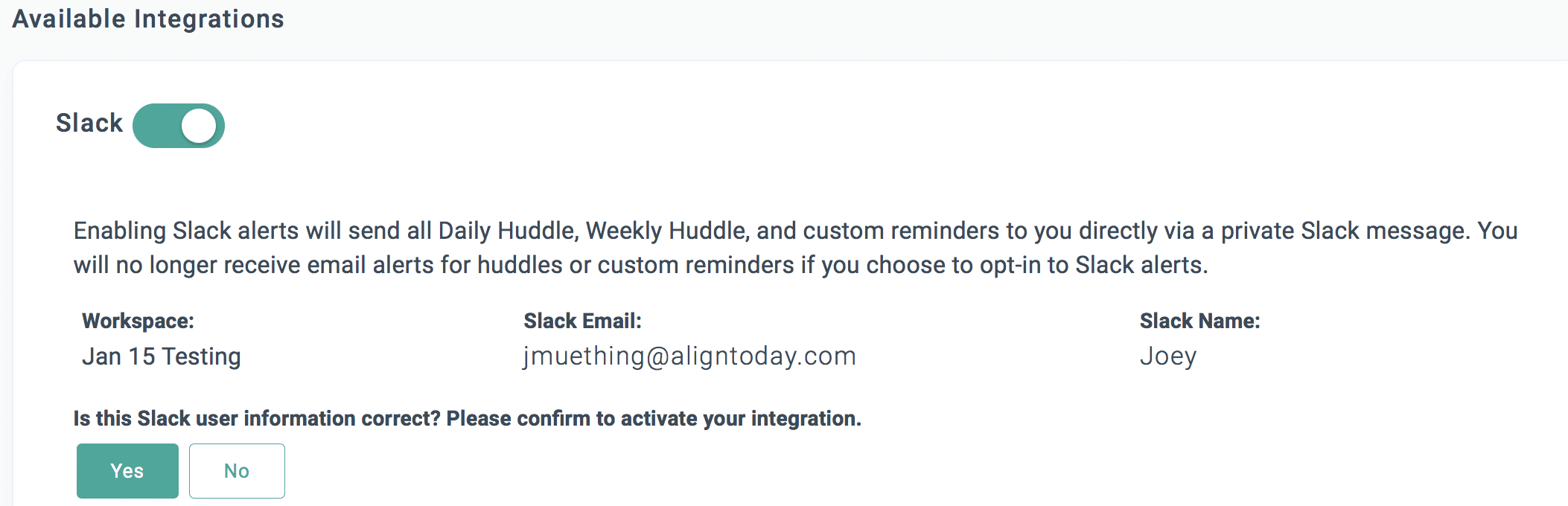 - Turn the Slack Alerts toggle ON. Align will try to find your Slack profile based on your Align email and user name. If Align is able to find a match, you will see the user information next to the toggle. If the match is correct, confirm and you’re done!