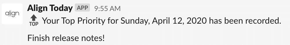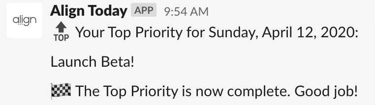 - Updates for all Align users’ Priorities and Tasks will appear in this channel, even if they are not integrated with Slack