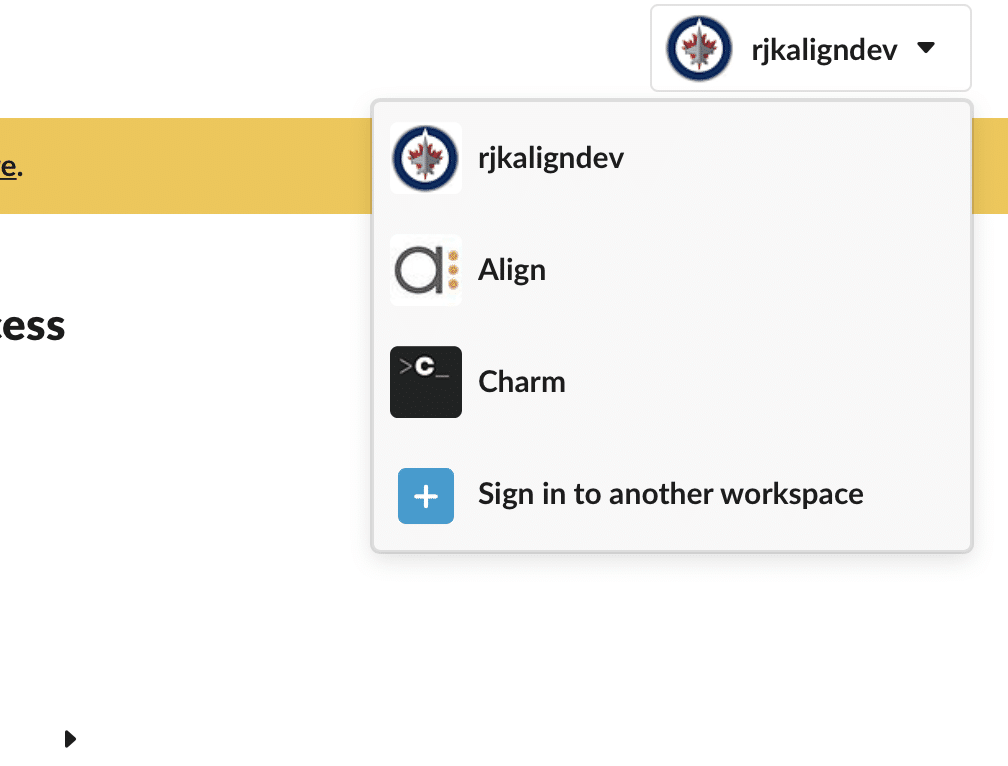 By default, Align will try to connect to the Slack workspace that you’re currently logged in to. If you’d rather connect to a different workspace, you can select it from the dropdown on the top-right corner of the screen: